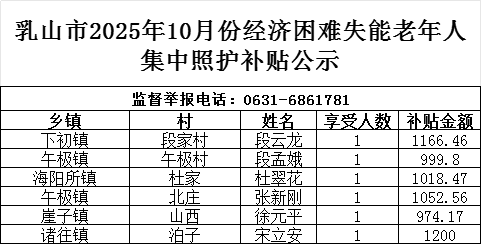 乳山市10月份經濟困難失能老年人集中照護補貼公示