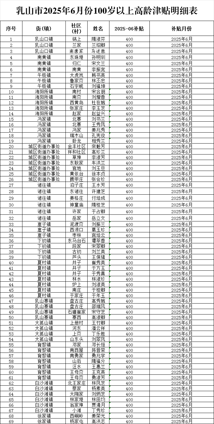 乳山市2025年6月份百歲老人長壽補貼發放統計表